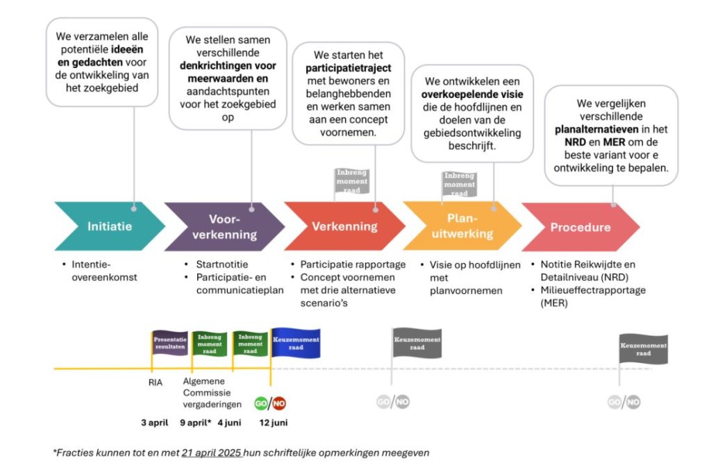 - Na 3 april volgen 2 Algemene Commissievergaderingen (op 9 april en op 4 juni) om de stukken te bespreken en input mee te geven, voordat de raad op 12 juni 2025 een beslissing gaat nemen of de initiatiefnemers hun ideeën verder kunnen uitwerken in een Verkenning.